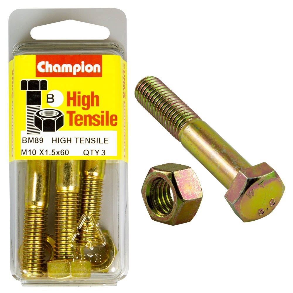 Champion Pack of 3 M10 x 60mm High Tensile Grade 8.8, Zinc Plated Hex Bolts and Nuts - BM89