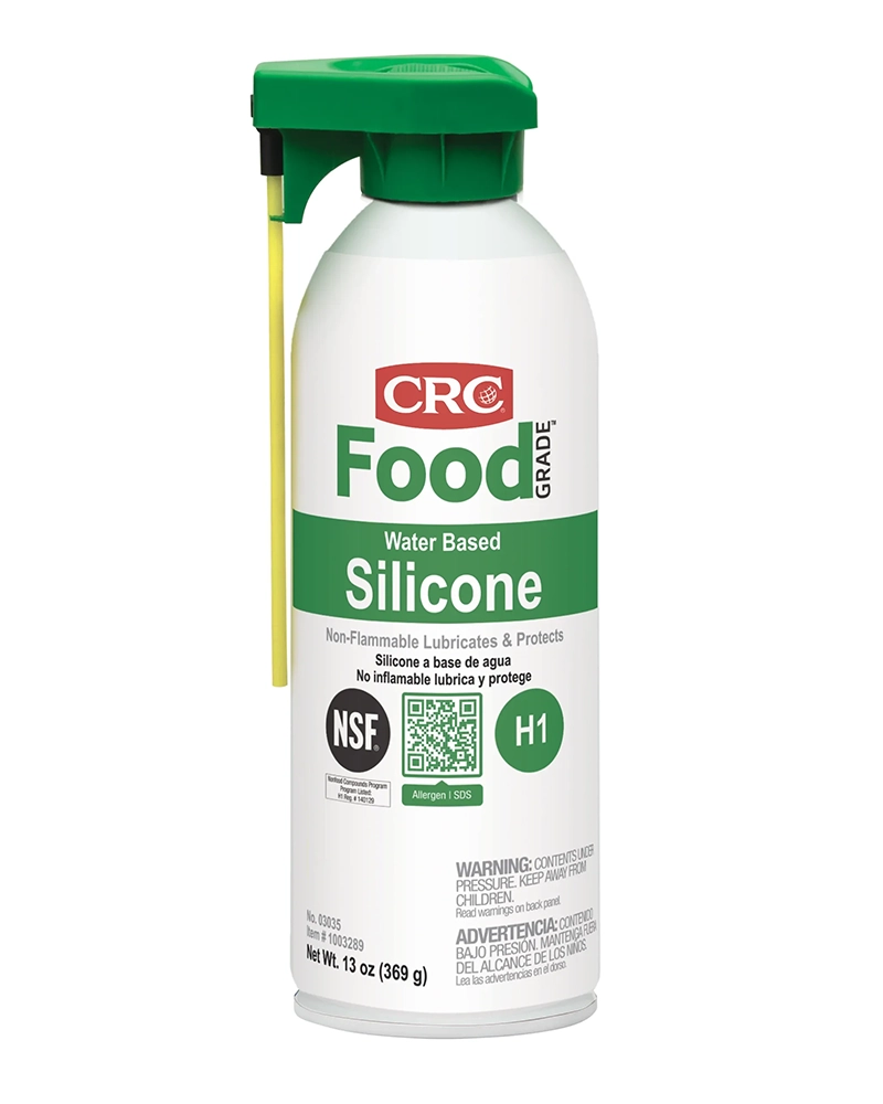 CRC Water Based Silicone is a non-flammable, NSF H1 registered multi-purpose silicone spray designed for food processing and handling applications. It forms a white emulsion that creates an odourless, non-staining film to lubricate and protect in most metal to non-metal applications. This silicone-rich formula effectively eliminates binding and sticking while safeguarding various surfaces.