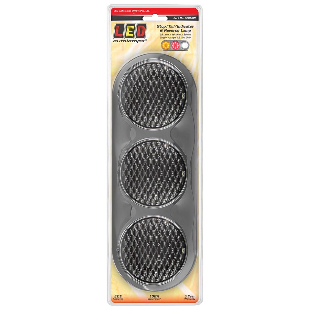 LED Autolamp's rear combination lamp features a clear lens and operates on 12 volts. This stop/tail/indicator/reverse assembly includes a chrome bracket and measures 281mm x 101mm x 30mm.