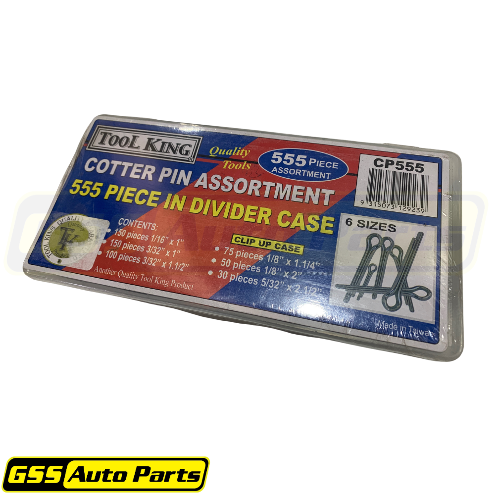 The Tool King Cotter Pin Assortment offers a comprehensive set of 555 pieces, neatly organized in a divider case for convenience. This assortment is perfect for a variety of applications, providing a range of sizes to meet diverse needs.