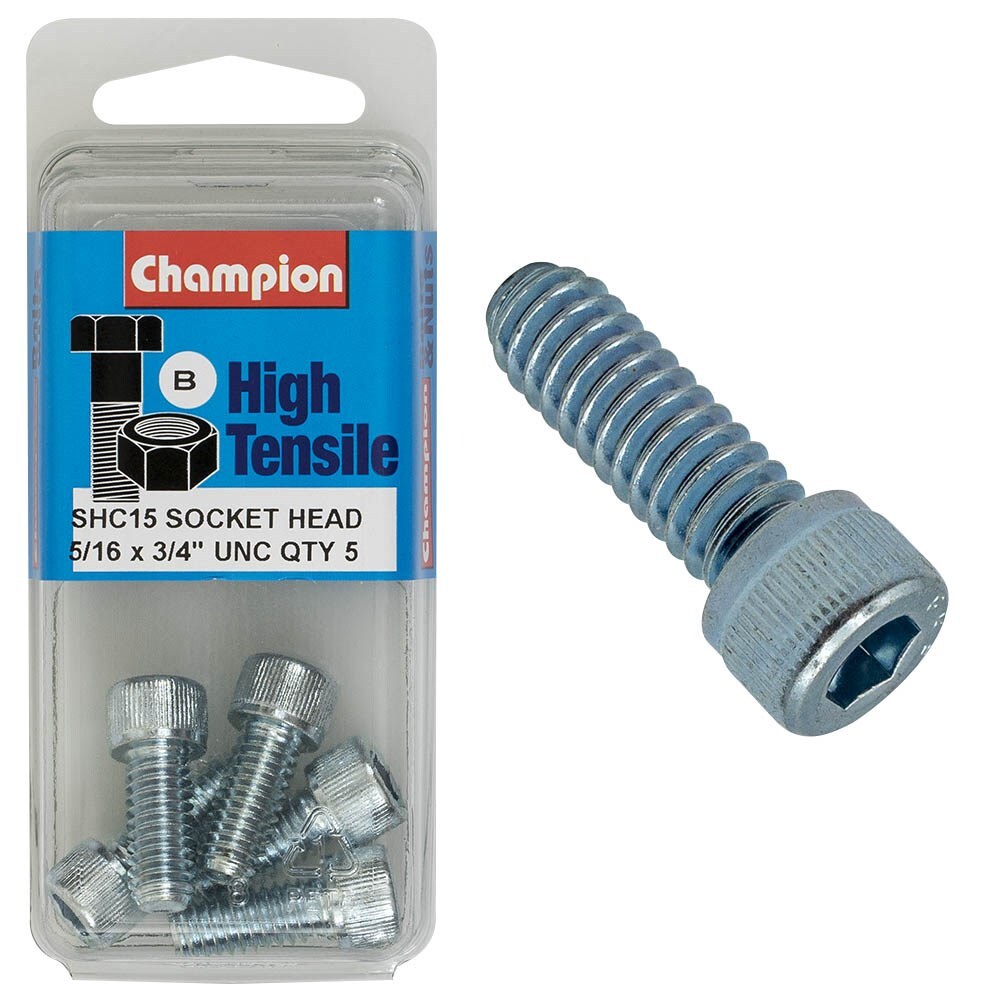 CHAMPION PACK OF 5 5/16" X 3/4" BSW HIGH TENSILE GRADE 8.8, ZINC PLATED SOCKET HEAD CAP SCREWS - SHC15